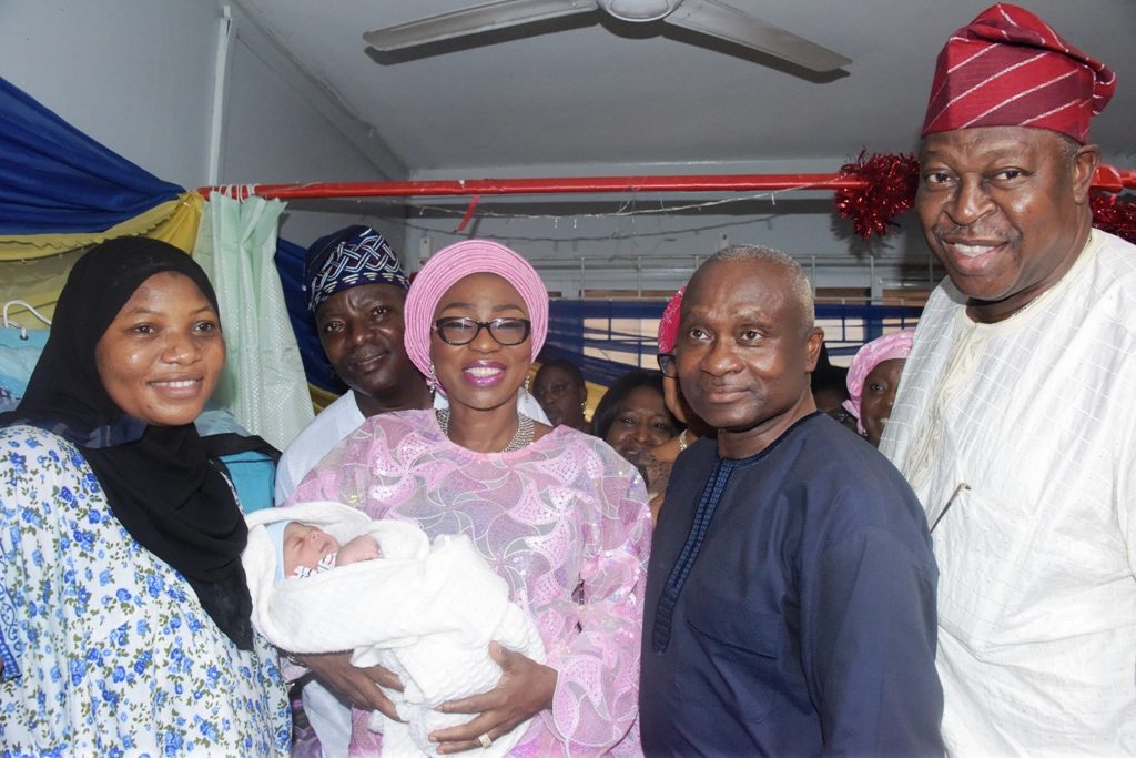 Wife of the Governor of Lagos State, Mrs. Bolanle Ambode, carrying the first baby of the year (2nd left); mother of the first baby of the year, Mrs. Basirat Adegbesan (left); Commissioner for Health, Dr. Jide Idris (2nd right) and Special Adviser to the Governor on Primary HealthCare, Dr. Olufemi Onanuga (right) during the presentation of gifts to the first baby of the year, born 12:00am, weighs 3.7kg, at the Lagos Island Maternity Hospital, on Tuesday, January 1, 2019.